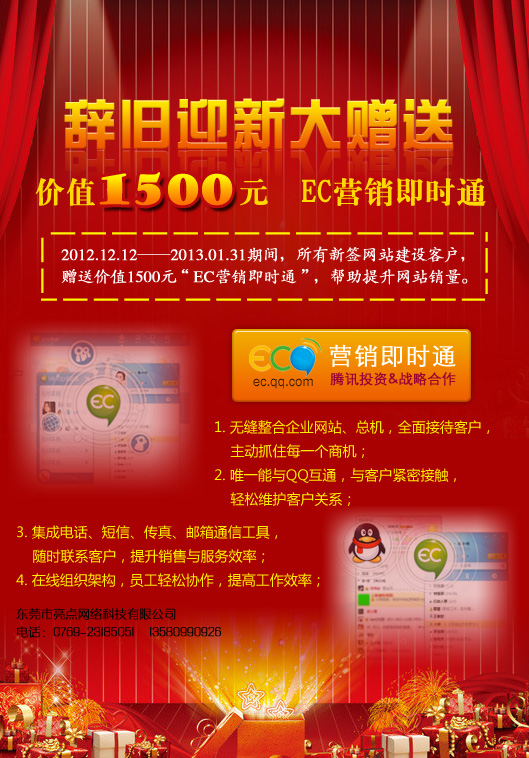 2012.12.12——2013.01.31期間,所有新簽網站建設客戶,贈送價值1500元“EC營銷即時通”,幫助提升網站銷量。